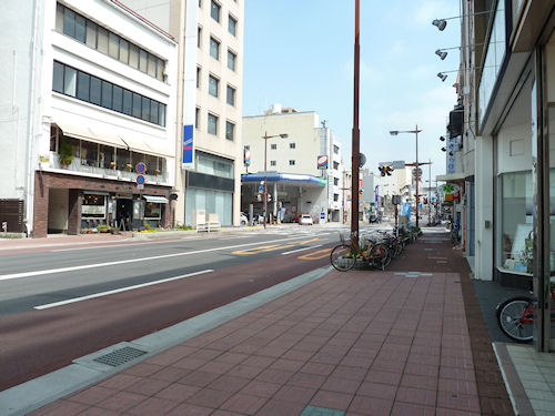スタジオから東を向くとこんな感じ。宝くじで有名な竹村商店とそば吉の交差点が見えます。